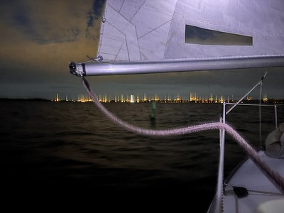 The second Thursday brought slightly cooler air and Xel-Ha hopping into the rabbit role. The planned course was K3 to D, twice around, but the wind Gods turned off the taps just as Xel-Ha made her first attempt as rabbit. A decision to abandon was endorsed by all. Shortly thereafter, a nice breeze of 4-6 knots filled in and Xel-Ha proposed a course of K3 to D, once around, before the wind died. The fleet chased the daylight down to the minute, finishing under a deep autumn sky. The wind didn’t die, leaving many sailors wishing we’d sailed another lap. While there were no northern lights this year, the collection of jibs, mains and spinnakers beautifully against the twilight, made their way back to the docks in style.